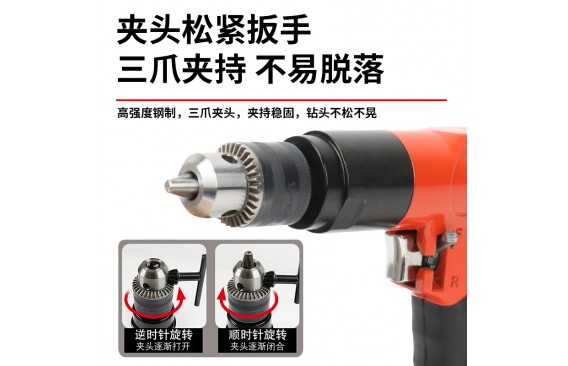 卡夫威尔气钻AS5165:按压式开关,推杆式正反转切换,机身总长170mm,宽42mm,高140mm;主体材质铝,橙黑色机身,手柄材质TPR;夹头尺寸:3/8(10mm);夹头范围1.5-10mm,夹头螺纹:3/8-24unf;进气接头:1/4";空载转速:2000rpm,单套净重1131g。