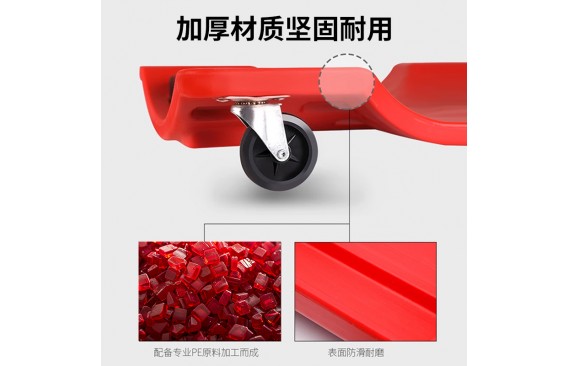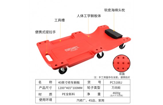 卡夫威尔躺板PC5187J:规格36英寸,材料PE全新料;产品尺寸920*430*100mm,两侧带工具槽,红色;六个万向轮子;轮子内芯PP料外包PU,轮子直径75mm,轮子厚度19mm,轮子架表面镀白锌,二个6.3*6.3MM方孔;单个轮子净重159克;单个轮子配二颗戴帽螺丝及2个垫片;整套净重:3700克(含六个万向轮);产品承载重量150KG;