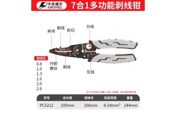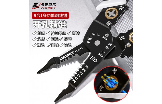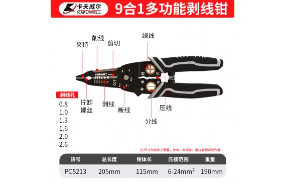 卡夫威尔剥线钳:9合1,带剥线、断线、分线、压线、夹持、拧卸螺丝、削线、绕线、剪线功能;总长205mm,宽55mm;净重190g;钳体长115mm,单面厚3MM,材质65Mn,整体热处理,硬度50±3HRC
