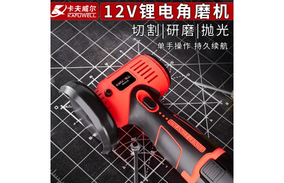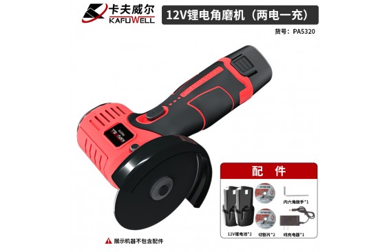 卡夫威尔迷你锂电角磨机PA5319:3“,裸机尺寸31.5*22*9.2cm,红黑配色,黑色全新TPE料,红色全新尼龙料(PA6+GF30);工作电压12V,额定功率400W,电池包1500mAH,空载转速18000R.P.M;有刷纯铜550电机;切割片安装直径75mm,切割厚度10mm。