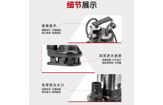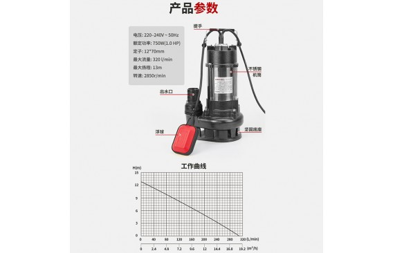 750W-GS污水泵:电压: 220 – 240V ~ 50Hz;额定功率: 750 W (1.0 HP);定子mm:12*70;最大流量:320 l/min;最大扬程:13m;转速:2850r/min;口径:2";电机铜线,铸铁叶轮,45#钢轴,带热保,9M线,带浮球,不锈钢机筒,铸铁泵头