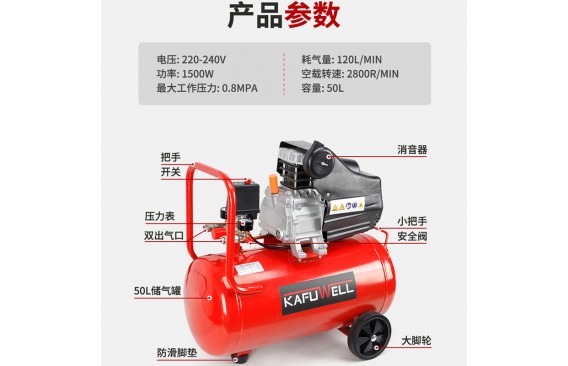 空气压缩机PA5567:有油,BS插头,机身红色喷漆,电压:220-240V,功率1500W,最大工作压力:0.8Mpa;耗气量:120L/MIN,空载转速:2800R/MIN;容量:50L;重量:26KG