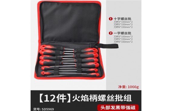 SD5969/12件螺丝批组套:规格12pcs, 组成明细:火焰柄螺丝批*2:刀杆3*150mm,一字(SD6610-1);火焰柄螺丝批*2:刀杆3*150mm,十字 (SD6610-2);火焰柄螺丝批*2:刀杆5*150mm.一字(SD6620-1);火焰柄螺丝批*2:刀杆5*150mm.十字(SD6620-2);火焰柄螺丝批*2:刀杆6*150,一字(SD6603-1);火焰柄螺丝批*2:PH2*150(SD6603-2);材质:S2,刀杆镀亚光,头部发黑带强磁,硬度54-56HRC;净重:775G;