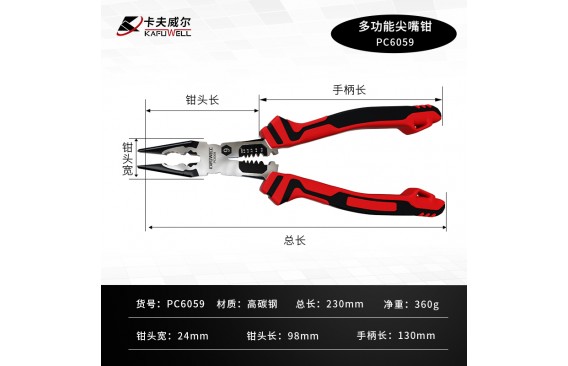 多功能钢丝钳:钳体55#高碳钢,表面发黑精抛,钳体硬度40-42HRC,刃口硬度48-50HRC,红黑双色TPR套柄;尺寸:总长223mm,钳头长91mm,钳头宽29mm,手柄长130mm;净重:378g;