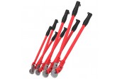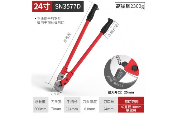 刀头材质65Mn,刃口硬度58-60HRC;连臂45#钢锻造,管柄Q235,橡胶防滑手柄;刀头为本色,连臂及管柄喷塑红色