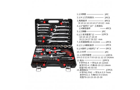 82件套套筒扳手组套,单套入一个三层中盒,再入一个五层外箱。