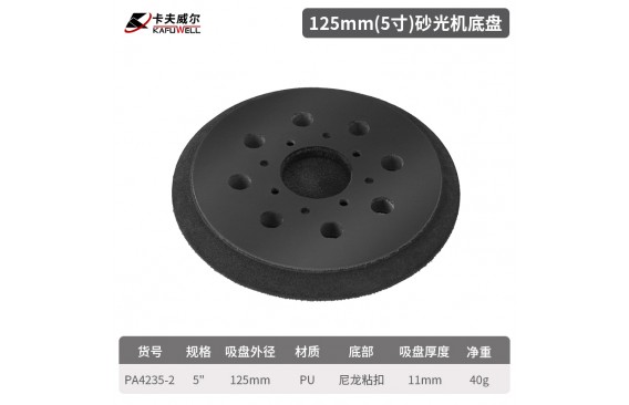 卡夫威尔20V锂电砂光机PA4235:裸机净重1075g,红黑配色,黑色全新TPE料,红色全新尼龙料;工作电压20V,空载转速:5000-10000 RPM,粘盘直径125mm,6档速度调节 ,带集尘袋,符合GS,CE,EMC标准;单个裸机搭配一张红棕色氧化铝自粘砂纸(120目*125mm)。可配5英寸砂光机底盘PA4235-2,8孔+4孔,PU材质,表面环氧板,底部尼龙粘扣,产品直径125mm,厚11mm;净重:40g。