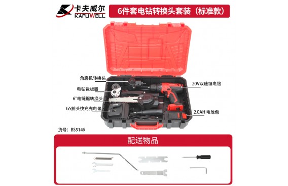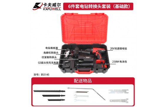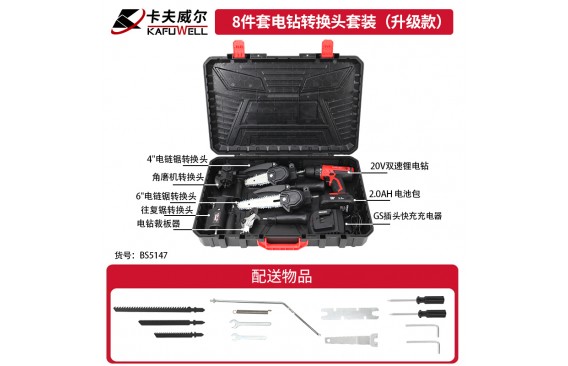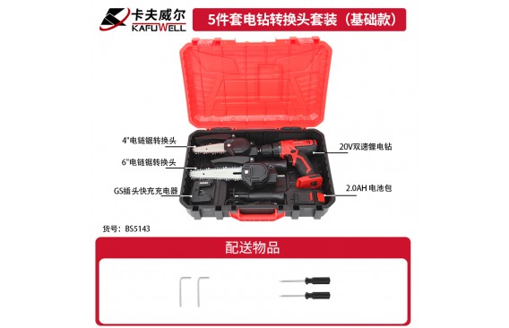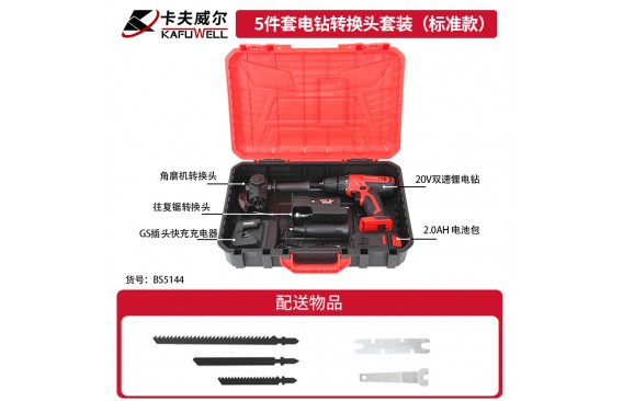 BS5142:5件套电钻转换头套装,1个角磨机转换头(BS4810),1个往复锯转换头(BS4808),1个电链锯转换头(BS4777),1个电链锯转换头(BS4776),1个电钻裁板器(BS4809)。BS5143:5件套电钻转换头套装(基础款),1台20V双速锂电钻 10mm/38N.m(PA4219),1个2.0Ah 电池包 20V(DC4210),1个GS插头快充充电器 输入:220-240V、50Hz/输出:21V、2.5A(DY4212),1个电链锯转换头 4"(BS4776),1个电链锯转换头 6"(BS4777)。BS5144:5件套电钻转换头套装(标准款),1台20V双速锂电钻(10mm/38N.m)(PA4219),1个2.0Ah 电池包 20V(DC4210),1个GS插头快充充电器 输入:220-240V、50Hz/输出:21V、2.5A(DY4212),1个角磨机转换头(BS4810),1个往复锯转换头(BS4808)。