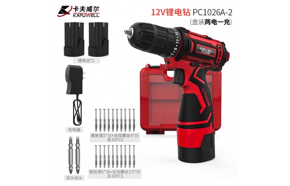 卡夫威尔锂电钻套装PC1026A-1:12V锂电钻裸机,红黑配色,黑色全新TPE料,红色全新尼龙料,10mm自锁夹头,机械双速调节,空载转速:0-350/0-1350RPM,25+1扭力设置,正反转功能,最大扭矩30N.m,带LED工作灯;单个裸机搭配一个1300mAh/3C电池包,一个12V线充充电器(0.5A),一份说明书,膨胀管5*31*10只,镀锌自攻螺丝4*35平头*10只,膨胀管6*36*10只,镀锌自攻螺丝3.5*30平头*10只,双头批头散货*2只