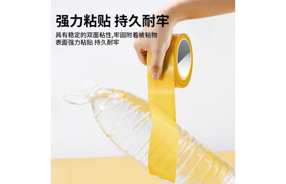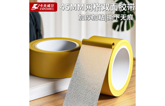 卡夫威尔双面网格胶带TE5259:尺寸:胶带宽度45mm,长度20m,胶带厚度0.4mm,网格厚度0.28mm;整卷外径125mm,内径77mm;净重335g;材质:黄色离型纸+玻璃纤维+热熔压敏胶;粘接性能:剥离强度(常态不小于4.0N/cm),持粘性(常态不小于2.0h)。