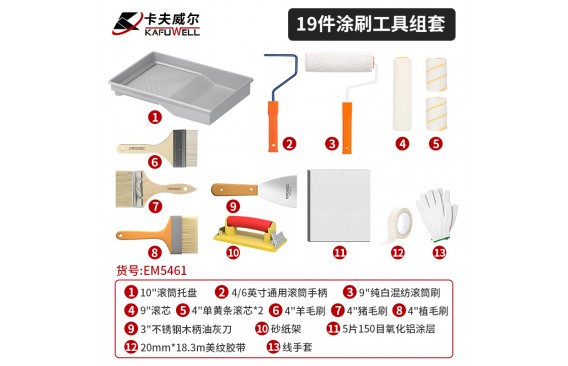 卡夫威尔19件涂刷工具套装EM5461:组成明细:4"猪毛刷*1,4"塑柄植毛刷*1,4"羊毛刷*1,10"滚筒托盘*1,9"纯白混纺滚筒刷*1,9"滚芯*1,4/6"通用滚筒手柄*1,4"可拆款滚芯*2,20mm*18.3m美纹胶带(白色)*1,3"不锈钢木柄油灰刀*1,150目氧化铝涂层砂纸*5,砂纸架*1,60g线手套*1。