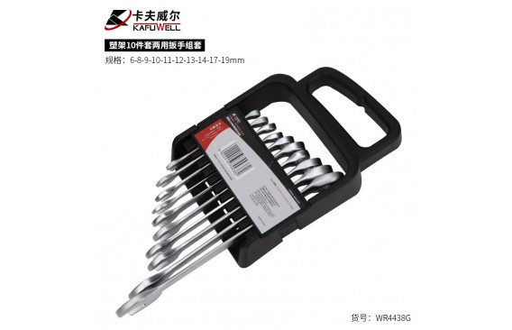 卡夫威尔塑架10件套两用扳手组:6-8-9-10-11-12-13-14-17-19mm,CRV,美式平筋,表面亚光,整体锻造热处理,塑架包装。净重:815g;包装方式:10支装,塑架上贴不干胶彩贴,合格证,整体热收缩。