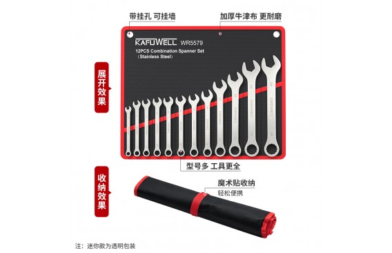卡夫威尔12件两用扳手组套(不锈钢款):3mm厚度;扳手规格明细:(6/8/9/10/11/12/13/14/17/19/22/24mm)*1;扳手净重:665g;材质:3Cr13,整体热处理,硬度46±4HRC,表面喷砂处理。