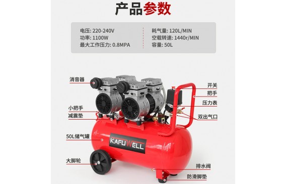产品介绍:无油,BS插头,机身红色喷漆,电压:220-240V,功率1100W,最大工作压力:0.8Mpa;耗气量:120L/MIN,空载转速:1440R/MIN;容量:50L;重量:22KG