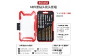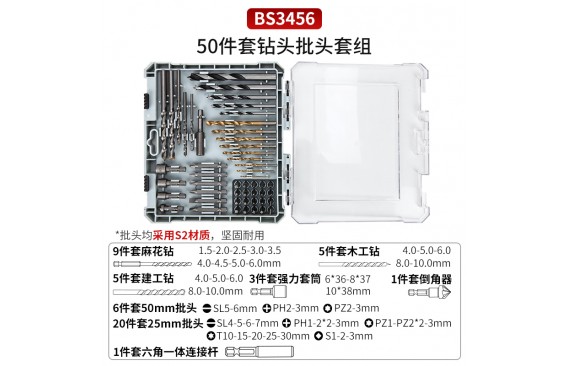 11pcs麻花钻头:材质HSS4241镀钛,磨边,硬度HRC60-63,规格:1.0,1.5,2.0,2.5,3,3.5,4,4.5,5,5.5,6;5pcs建工钻:喷砂,柄部为#45碳钢,尖端为碳化钨YG8C。刀柄硬度为HRC 42-48,刀尖硬度为HRC:88-91,规格:4.0,5.0,6.0,8.0,10.0mm; 5pcs木工钻头:全自动开口,材质#45碳钢,硬度HRC45-55,规格:3.0,4.0,5.0,6.0,8.0;20pcs:25mm批头:材质S2带喷砂,硬度HRC48-51,规格:十字PH1、PH2、PH3,米字PZ1,PZ2,PZ3,一字3mm,4mm、5mm、6 mm,星型T15,T20,T25,T30,方型S1,S2,S3,六角头H4、H5、H6;3pcs强力套筒:材质50BV30表面喷砂,硬度:HRC45-48,规格:6*36mm、8*37mm、10*38mm; 2pcs木工扁钻:#45碳钢,硬度HRC40—48,规格:13-19mm;1pcs六角一体接杆,6*60mm,材质50BV30;1pcs倒角器