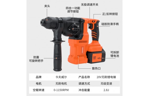 卡夫威尔(KAFUWELL)直流式无刷电动工具系列 工业级锂电锤PA4574H,捶钻打孔,锤击开槽,装修、工用面面俱到