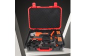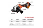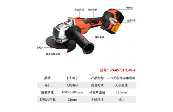 20V无刷锂电角磨机:橙黑配色,黑色全新TPE料,橙色全新尼龙料;工作电压20V,空载转速:4000-8500rpm(6档调速),带主轴锁,砂轮片安装直径:125mm,电机类型:无刷电机PW4825,符合GS,CE,EMC标准 。配件有1个固定手柄、1个金属防护罩、1片砂轮片、1个安装扳手。