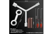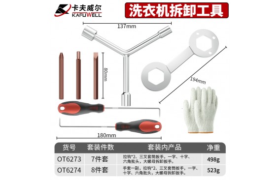 洗衣机拆卸工具OT6273:7PCS,H5六角批头1支,8mm一字批头1支,PH3十字批头1支,材质均为S2,表面古铜色,整理热处理,硬度56-58HRC;钩子1对,手柄红黑配色PP+TPR,钩子总长180mm,勾子长度9mm,45#碳钢,整体热处理,表面镀铬,勾子硬度43-46HRC;三叉套筒扳手,规格8-10-12mm,Q235材质,表面镀锌,无热处理;离合器扳手1个,规格36/38mm,Q235材质,表面镀锌,无热处理;重量552g