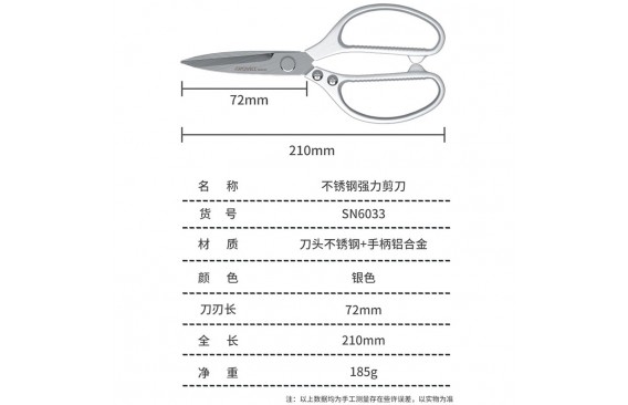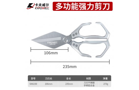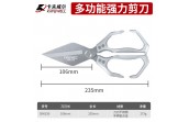 多功能强力剪SN6150:产品尺寸:235*106*17mm;刀片材质不锈钢,刀片厚度3.6mm,硬度46-48HRC;手柄材质铝合金,银色,厚度13mm;重量:273g
