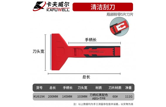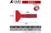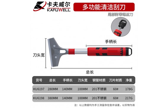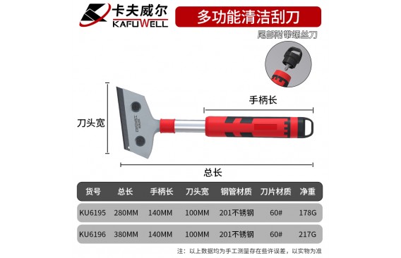 多功能清洁刮刀KU6197:刮刀总长280mm,刀头宽度100mm,刀头材质压铸铝,钢管201不锈钢,直径19mm;刀片60#碳钢;刮刀尾部带内置批头,批头45#碳钢;刀柄红黑配色ABS+TPR,红色