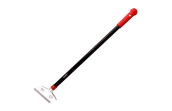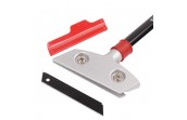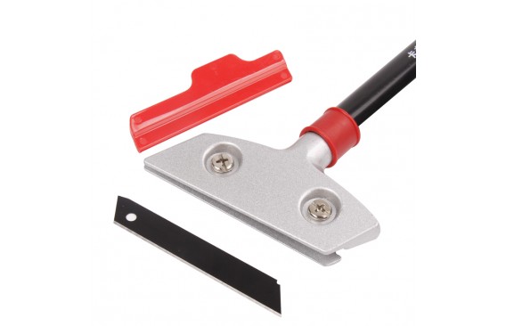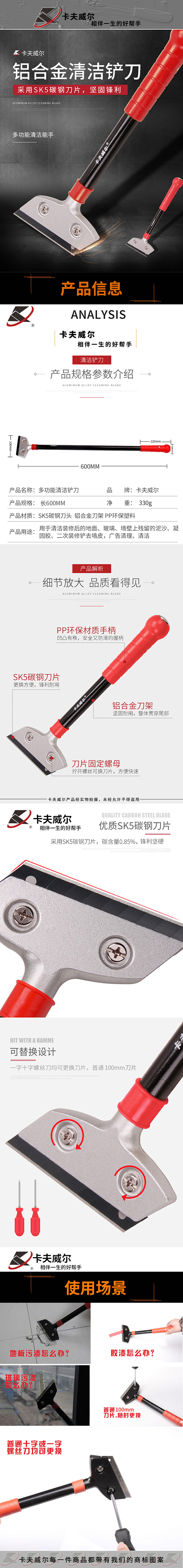 刮刀总长600mm,刀头宽度115mm,可换高碳钢刀片,厚度0.5mm,刀片上套塑料保护套,银灰色铝合金杆头部,黑色A3钢铁管直径19.3mm,全新料手柄套; 总重330g.