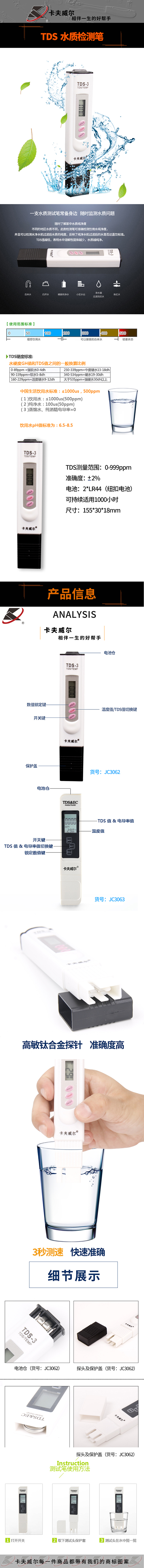 水质检测笔:TDS黑白款,3按钮,液晶显示屏,溶解性固体含量(TDS)测量范围0-9999ppm。外壳ABS材质,产品使用钛合金测水探头,内带2颗1.5V纽扣电池(LR44),5分钟无操作自动关机,工作温度0~80℃。