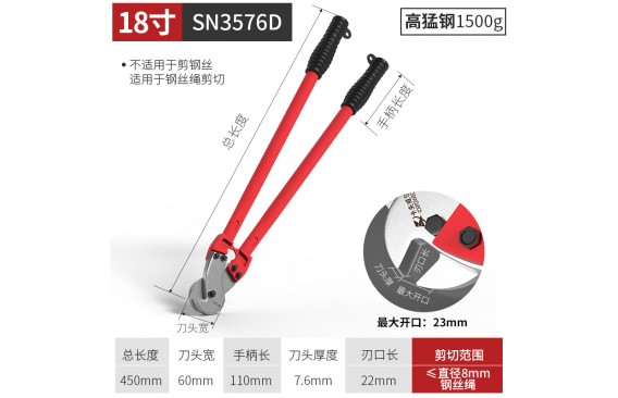 刀头材质65Mn,刃口硬度58-60HRC;连臂45#钢锻造,管柄Q235,橡胶防滑手柄;刀头为本色,连臂及管柄喷塑红色